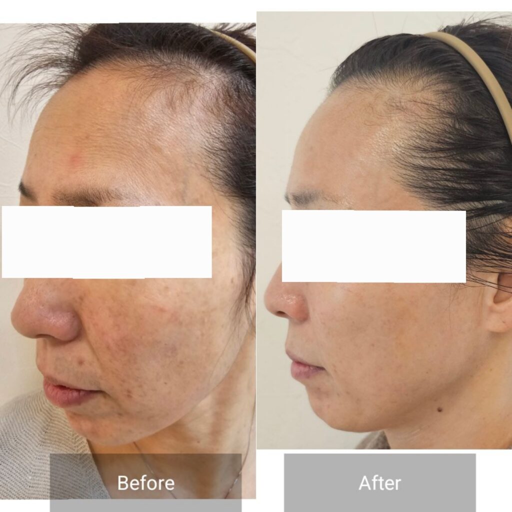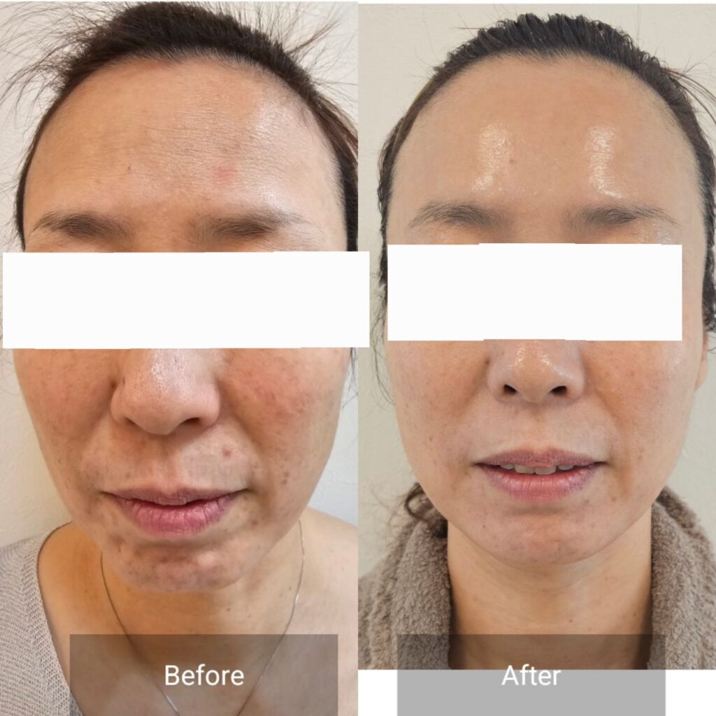 (40代女性)お肌の炎症やニキビ、シミが治ってもまた出るを繰り返していて、美容医療や皮膚科、エステも通われていたがなかなかなおらない状態でした。皮膚が薄い分、シワや乾燥しているところも多く、お肌を触ると赤くなったりホテリも感じられていました。体調にも大きく肌状態が左右される超敏感なお肌質。